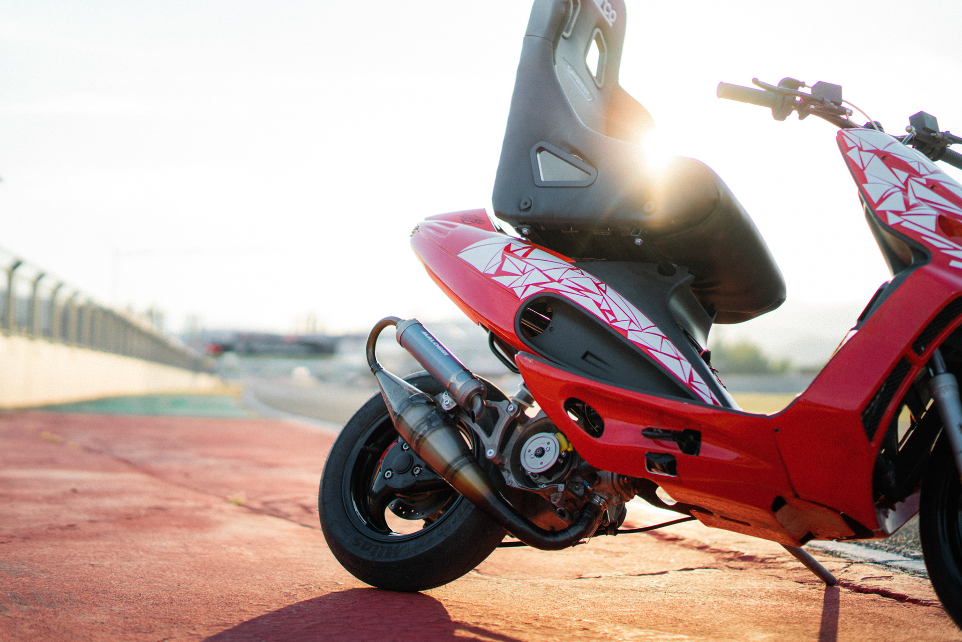 L’unico F12 che riesce ad essere figo ed originale anche senza le palpebre sull’anteriore che son passate di moda nel 2009. Un progetto al limite dei limiti, ma che grazie a qualche truciolo, staffe e bulloni è riuscito a superarli. Ad Henry avanzava un po’ di carta adesiva bianca (forse fin troppa), a Mattia un bel po’ di grinta e i 1640 metri di asfalto di Varano erano perfetti per unire le due cose. Vedere il Phantom sfrecciare era un successone per tutti, quanto una super ansia: durante i test, non c’è stato tempo per trovare un accordo o un piano B nel caso il motorino avesse smesso di funzionare in pista, lasciando Mattia in balia dell’inerzia, fino a trovare un punto dove appoggiarsi. È andata bene, benissimo.